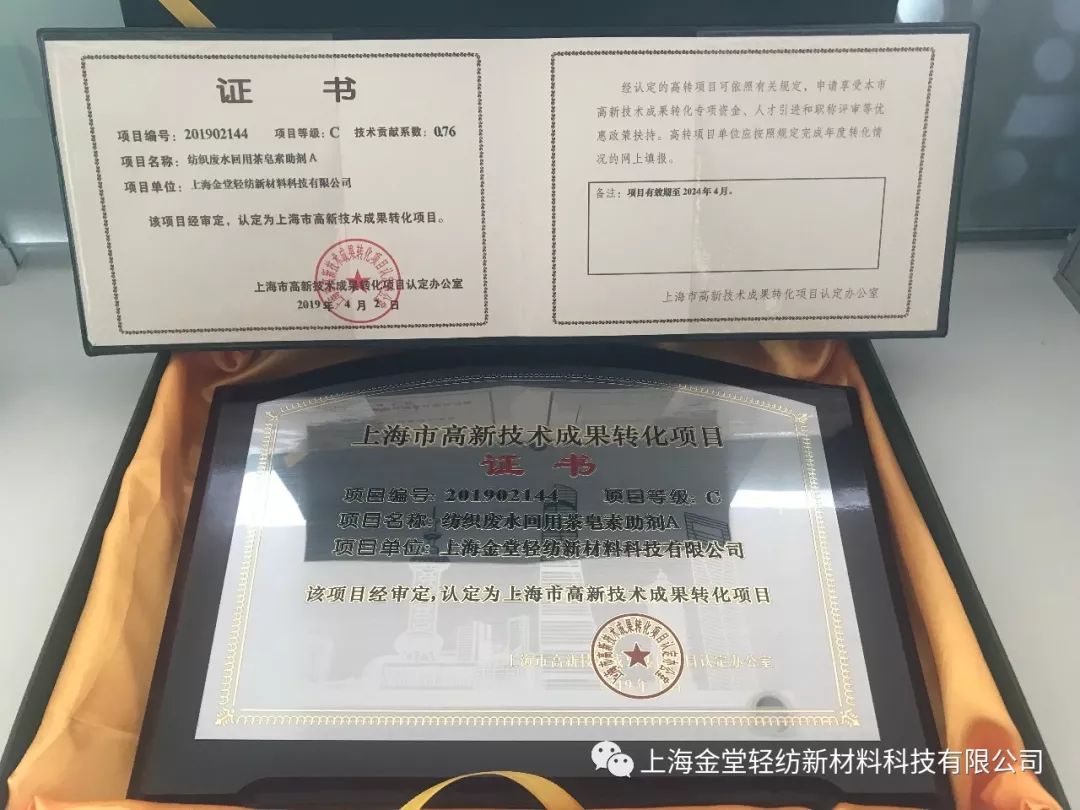 In order to solve the stubborn problems in the pre-treatment of printing and dyeing fabrics and promote the healthy, green and sustainable development of the printing and dyeing industry, Shanghai Jintang Textile New Material Technology Co., Ltd. has been sharpening its sword for ten years and successfully developed the Bu Gong tea saponin additive. Recently, it was awarded the second batch of Shanghai high-tech achievement project certification in 2019.