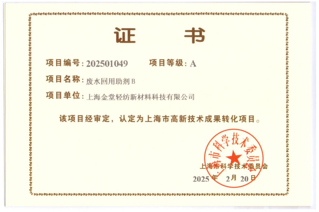 ? ? ? 近日,上海市科學技術委員會公示了2025年上海市高新技術成果轉化項目名單,上海金堂輕紡新材料科技有限公司憑借自主研發的紡織印染V3.0成果之一“廢水回用助劑B”成功入選,并獲評A級項目。這是繼公司多次獲評“國家高新技術企業”后,在科技成果轉化領域取得的又一重要突破。