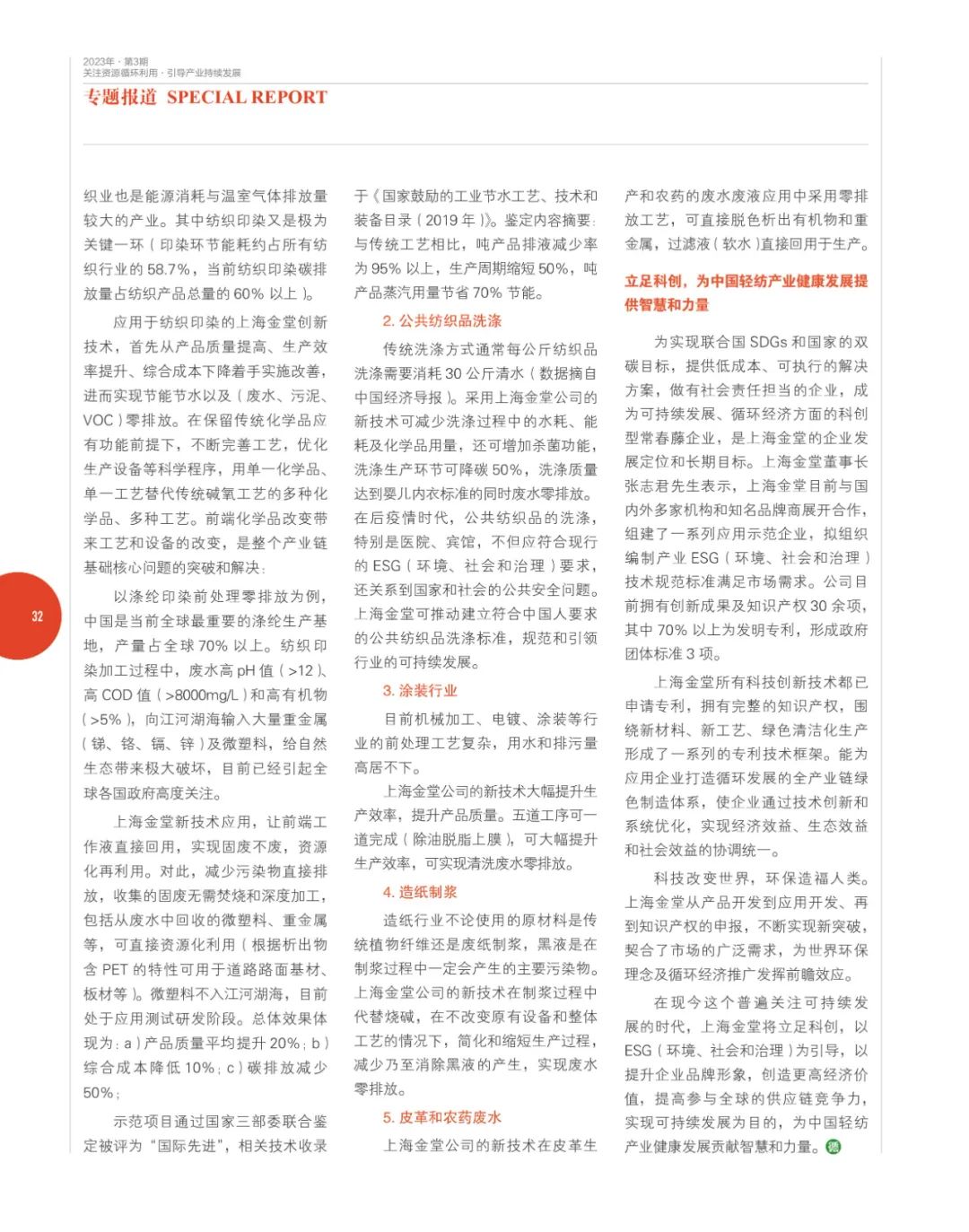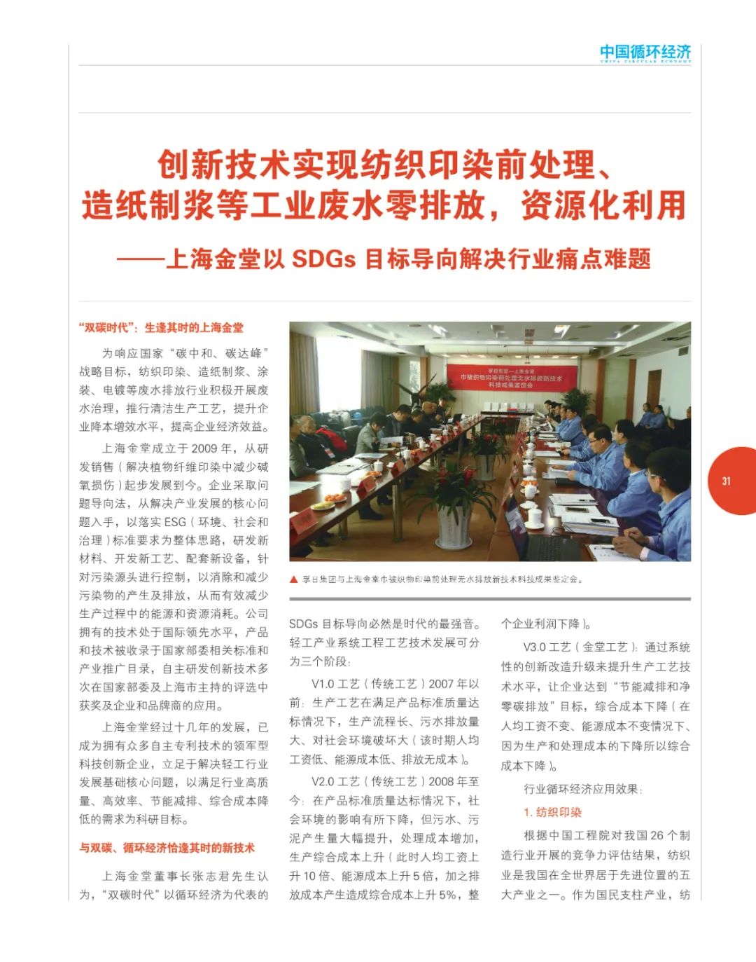 ? ? ? 近日,《中國循環(huán)經(jīng)濟》雜志發(fā)文,重點報道了上海金堂以全球首創(chuàng)的紡織印染低碳前處理工藝新技術(shù)及產(chǎn)品為代表,在SDGs(聯(lián)合國可持續(xù)發(fā)展)國際公認理念目標導向下,助力企業(yè)解決環(huán)境保護與盈利發(fā)展困局難題,以建立產(chǎn)業(yè)ESG技術(shù)規(guī)范標準為抓手,為行業(yè)未來發(fā)展開拓空間的創(chuàng)新成果。