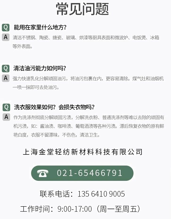 1.脫排油煙機:將粉體溫水溶解成液體(1升水加入15克粉體),噴于油污表面或浸泡脫排油煙機濾網(wǎng)在稀釋液中 。待3-5分鐘后再用抹布搽干凈或清水沖凈。